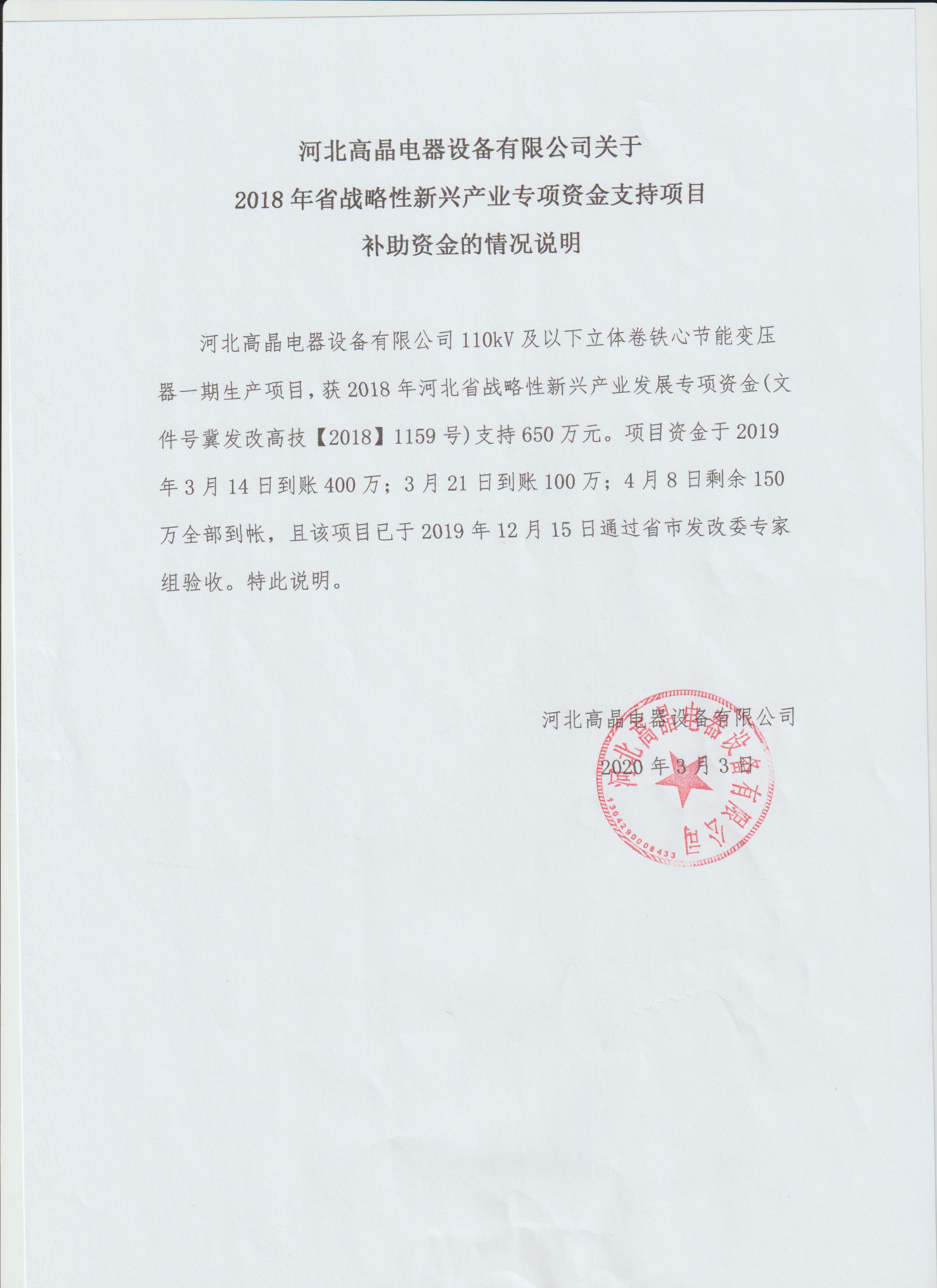 根據(jù)《河北省高技術(shù)產(chǎn)業(yè)發(fā)展項(xiàng)目管理暫行辦法》,2019年12月15日,邯鄲市發(fā)展和改革委員會在永年區(qū)組織召開了由河北高晶電器設(shè)備有限公司承擔(dān)的110kV及以下立體卷鐵心節(jié)能變壓器一期生產(chǎn)項(xiàng)目(年產(chǎn)2000MVA S13型110kV及以下立體卷鐵心節(jié)能變壓器)驗(yàn)收會。會議邀請技術(shù)、經(jīng)濟(jì)專家組成驗(yàn)收組,驗(yàn)收組聽取了項(xiàng)目工程竣工報(bào)告、技術(shù)總結(jié)報(bào)告和財(cái)務(wù)決算報(bào)告,審閱了財(cái)務(wù)專項(xiàng)審計(jì)報(bào)告及有關(guān)驗(yàn)收材料,并考察了項(xiàng)目現(xiàn)場。經(jīng)質(zhì)詢和討論,該項(xiàng)目完成了各項(xiàng)建設(shè)內(nèi)容,達(dá)到了批復(fù)的總體目標(biāo)和要求,同意通過驗(yàn)收。